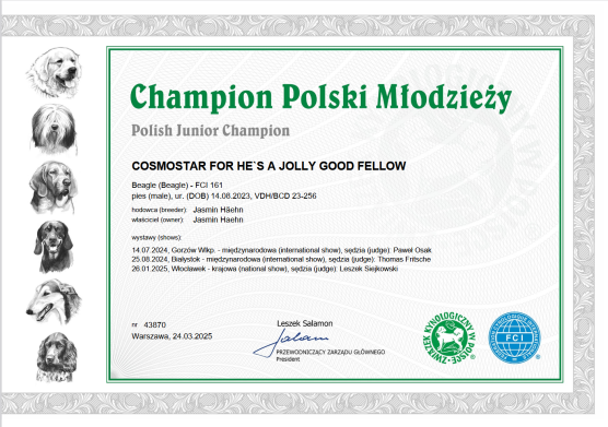 Wir haben mit ihm ein halbes Jahr die Hundeschule besucht und auch mit Ringtraining begonnen, die ersten Ausstellungen in der Jungendklasse verliefen dann schon recht erfolgreich. Er hatte schnell den polnischen Jugendchampion erworben und danach auch den polnischen Championtitel.