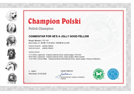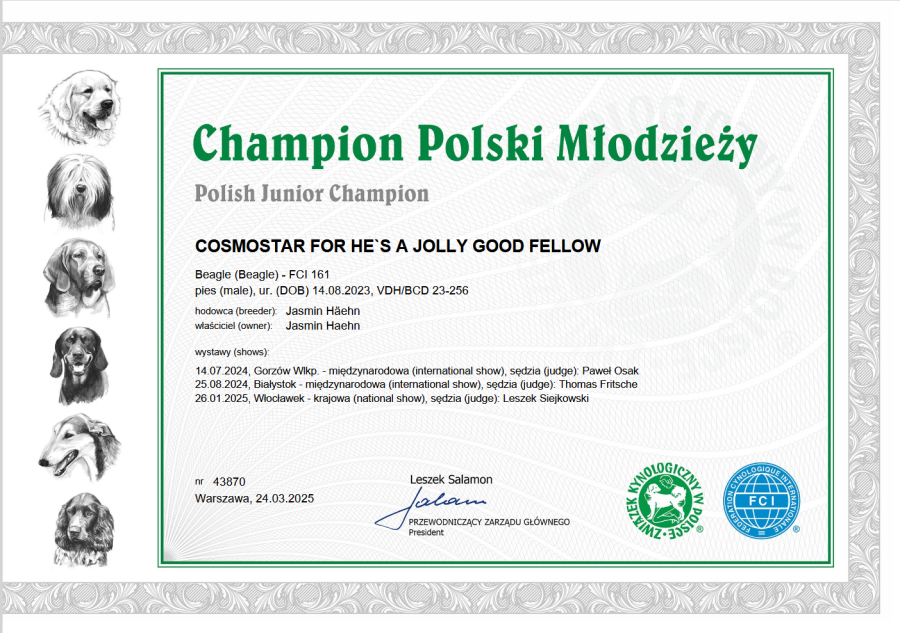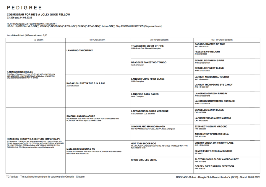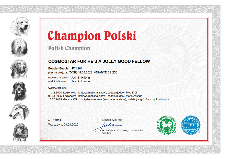 Er hat die Zuchtzulassungsprüfung des Beagle Club Deutschland e.V. am 21. Juni 2025 bestens bestanden und ist seitdem zur Formwert- und Siegernachzucht zugelassen.